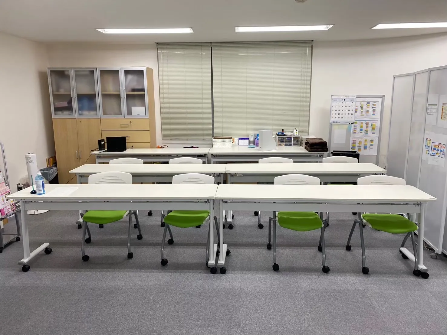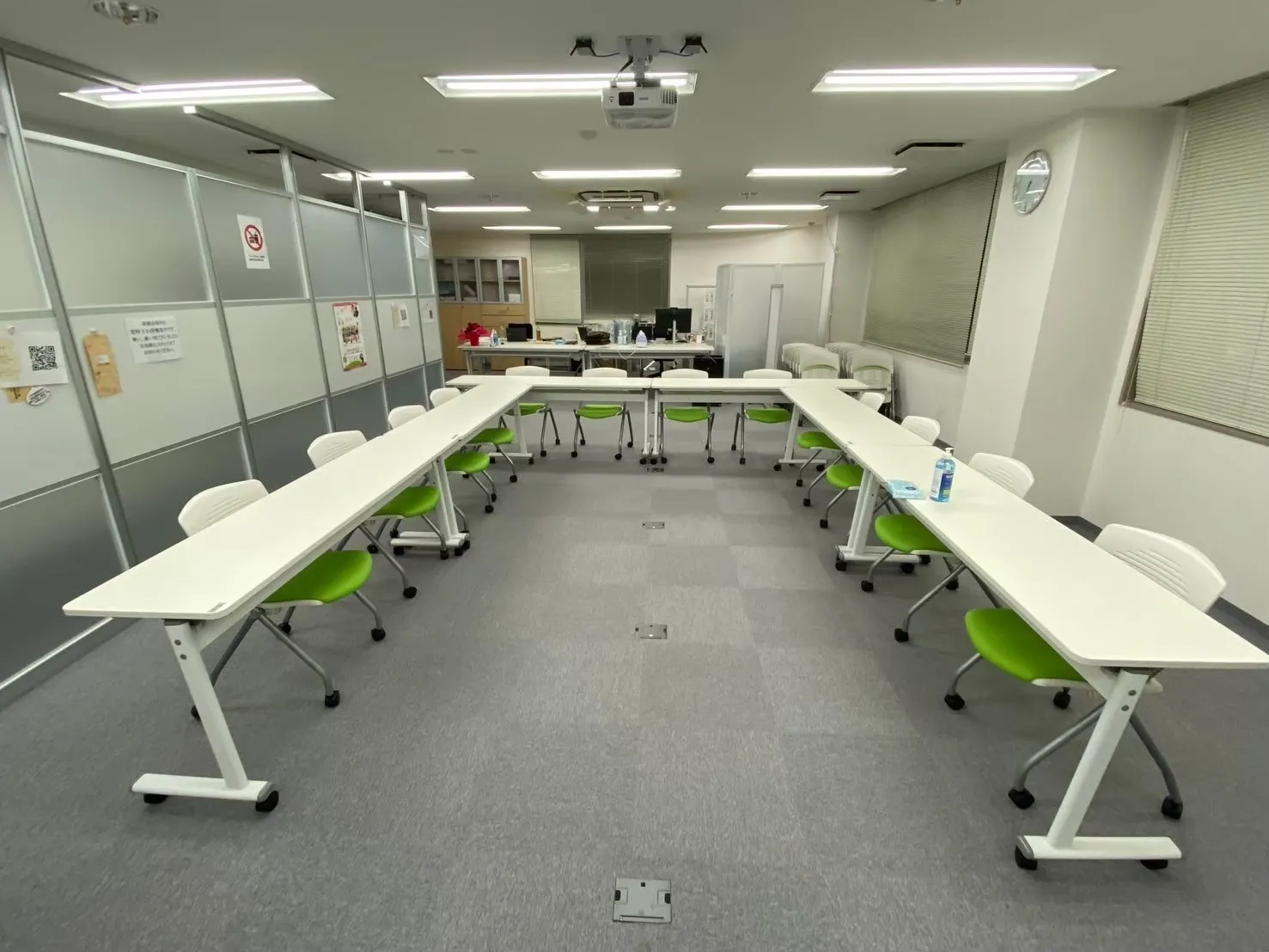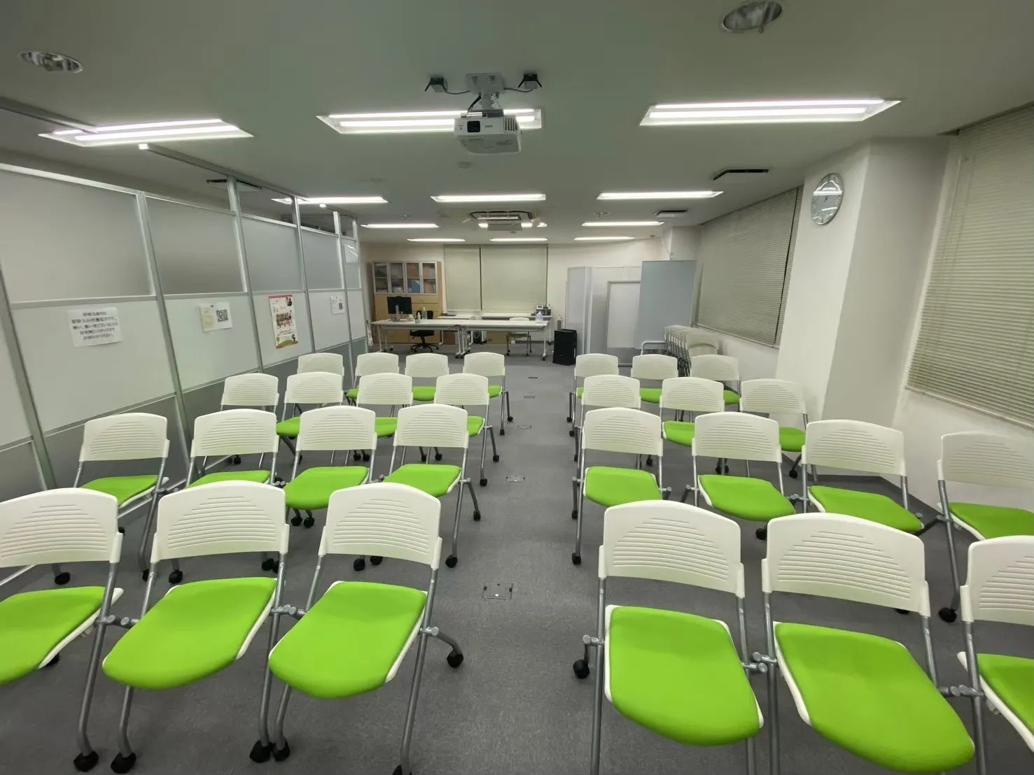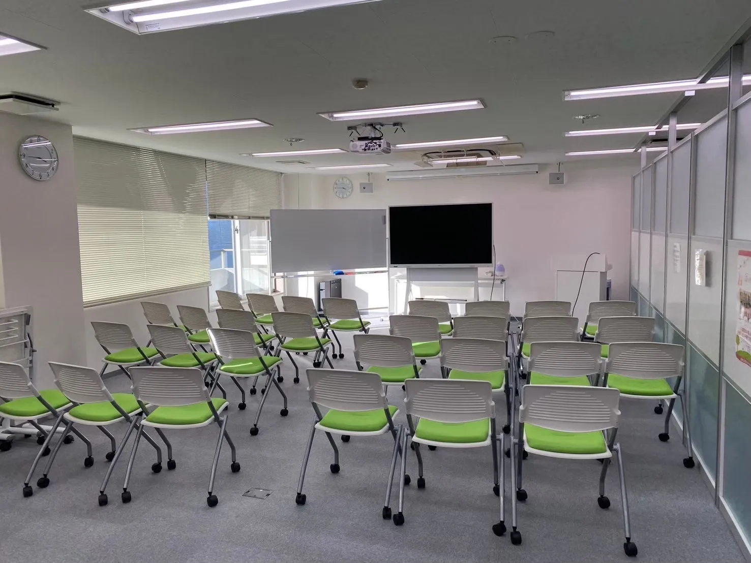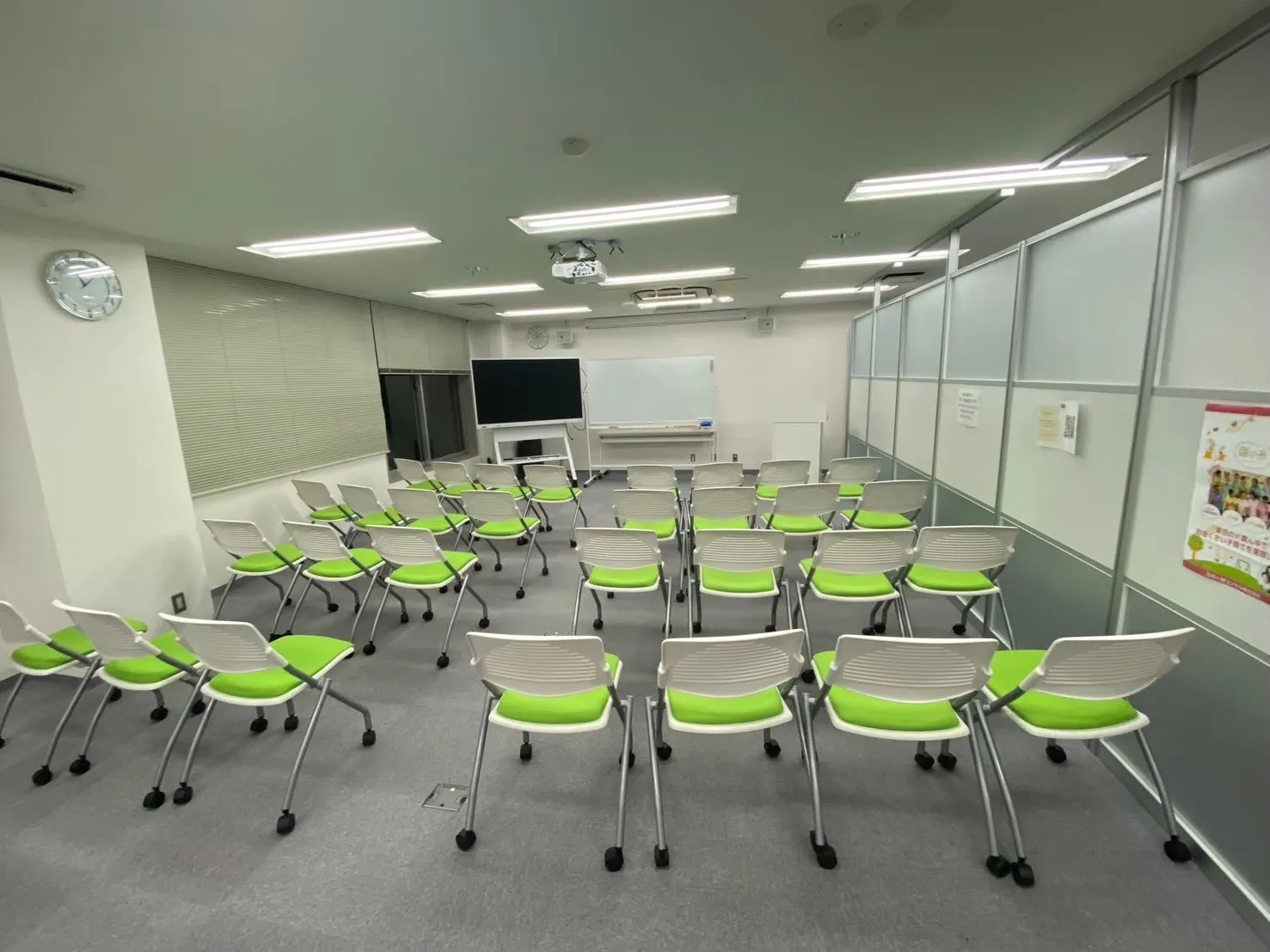 長机(11台)、椅子(31脚)/ワイヤレスマイク(2本)・ピンマイク(1本)/ホワイトボード(通常+電子)/ペン