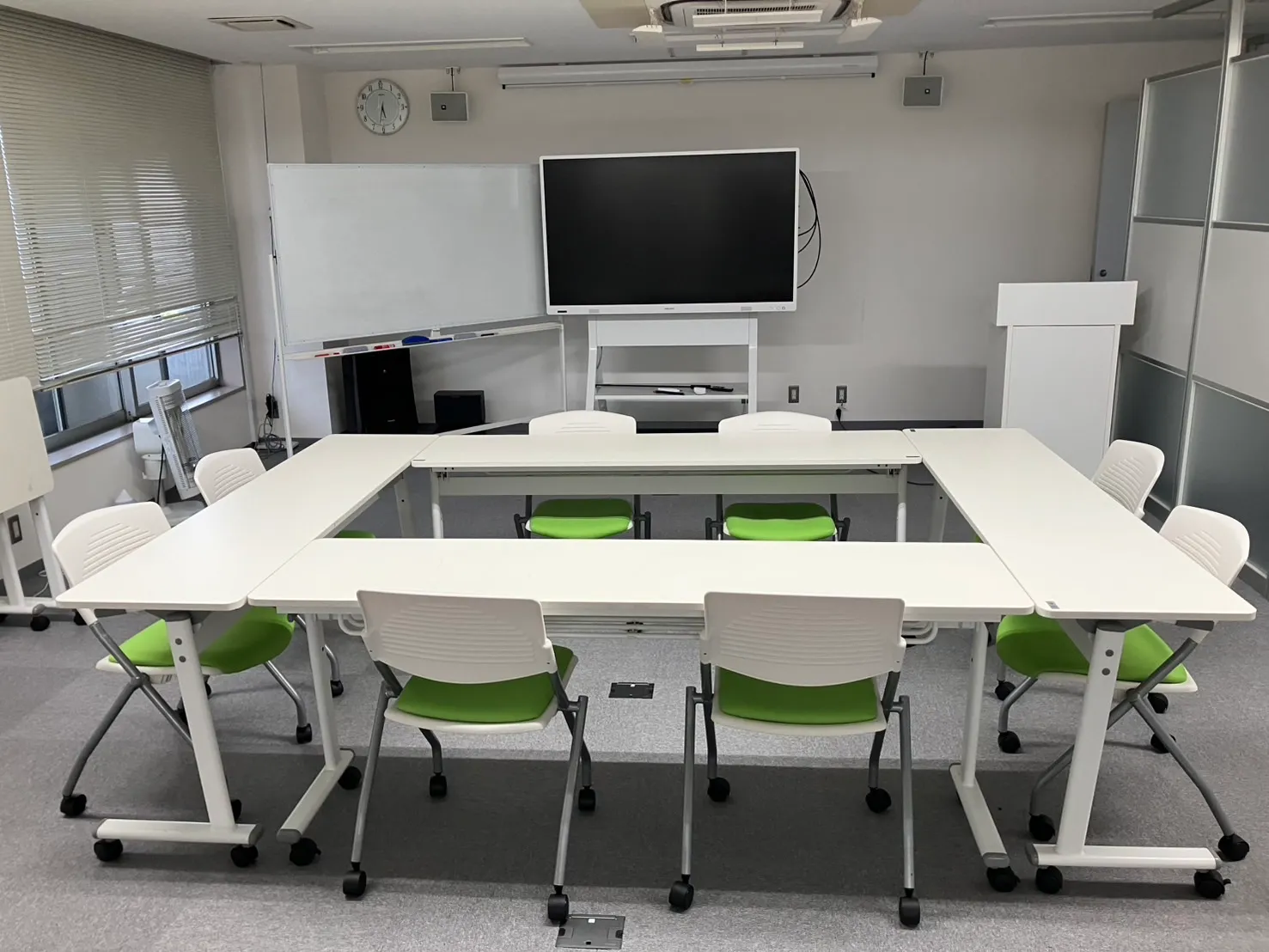 長机(11台)、椅子(31脚)/ワイヤレスマイク(2本)・ピンマイク(1本)/ホワイトボード(通常+電子)/ペン